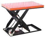 These Electric Scissor Lift tables uses a control box with UP and DOWN button, EMERGENCY STOP. External power pack equipped with a relief valve against overloading and compensated flow valve for control lowering speed and achieve a low close height, eliminating the need for a pit installation. Upper platform filled with safety perimeter to prevent descent on contact with obstructions.