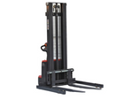 It can enter load units from underneath to lift loads and has forged forks that users can lower to the floor and laterally offset support arms. The electric stacker offers an attractive appearance, convenient operation, and features.