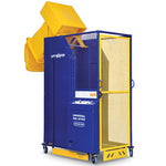 The unit is controlled by push buttons to eliminate all manual handling operations. When activated, the bin tipper springs in to action to lift and empty the bin in a 40 second cycle. Its interlocked safety cage and door, removes all possible hand/foot crush points. This guarding guarantees extra protection for users and bystanders. The bin tipper functions on a battery (making the unit completely portable) with a charger. It also can run permanently on mains power, while the battery is charging.