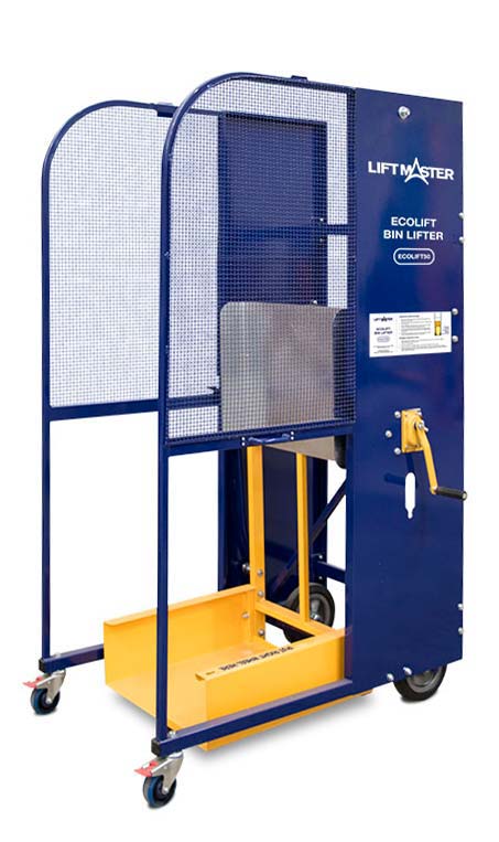 -The lifter eliminates all lifting from the process of emptying wheelie bins into larger dumper bins. The bin is lifted by simply manually rotating the crank handle. The user is protected against costly back injuries