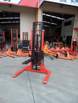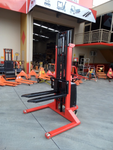 Semi Electric Stacker with Straddle Leg, Load capacity 1500kg, Max. height 3500mm, Fork length 1150mm, each straddle legs with small lifting bar, Battery 120Ah, Motor 1.6kw.